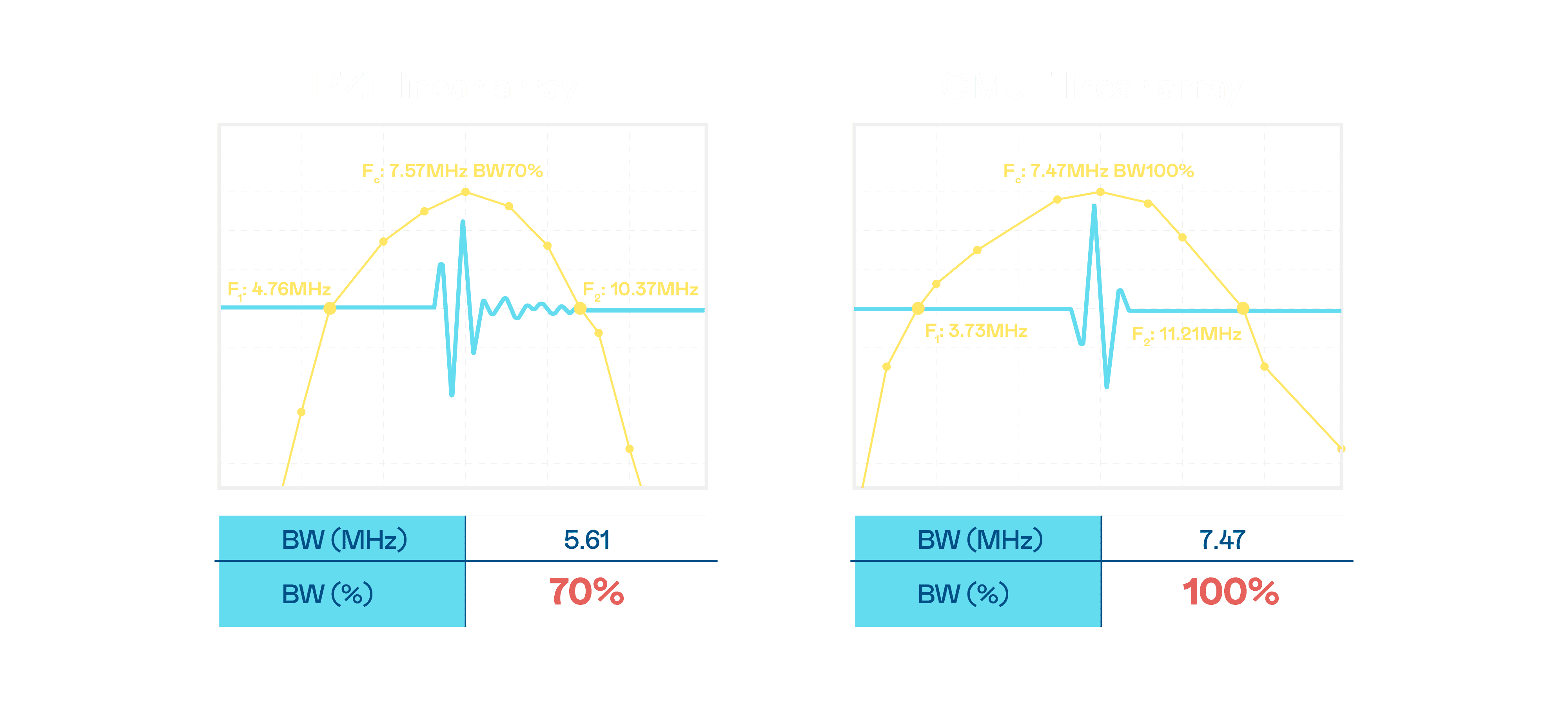 超音波影像的解析度高低,,,首先取决于探头能发出的讯号频宽。。。红龙扑克 CMUT 可提供高清晰的超音波讯号,,提供高频宽、、、高灵敏度、、、影像纹理细节更高的超音波影像,,协助医护人员缩短影像判读时间及利用精准的医疗影像进行诊断。。。